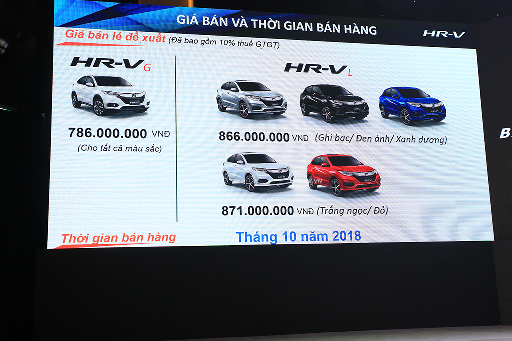 Với mức giá bán lẻ đề xuất của hai phiên bản 1.8G và 1.8L lần lượt là 786 và 866 triệu đồng (riêng phiên bản 1.8L với 2 màu trắng và đỏ đặc biệt có giá 871 triệu đồng), Honda H-RV hứa hẹn sẽ trở thành lựa chọn sáng giá trong phân khúc crossover hạng B. Xe có nhiều màu sắc (tùy phiên bản) cho khách hàng lựa chọn: Trắng, Đỏ, Đen, Bạc, Xanh và sẽ được chính thức phân phối tại các Đại lý Honda Ôtô từ tháng 10 năm 2018.